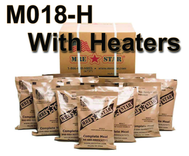 Best-Selling MRE Meals: The M-018H is our most popular MRE meal product for good reason. The M-018H is a premier military spec Meal, Ready To Eat. No water is required to reconstitute the MRE meal. Each case stocks 12 hearty and delicious single complete meals averaging 1200 calories per meal kit. These 12 complete meals are individually packaged and hermetically sealed – watertight and freshly dated for maximum shelf life.