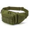 - Large Capacity: The tactical fanny pack measurements are 16 × 6 × 4 inches with large capacity and multiple pockets and compartments. This includes 1 front zipper pocket, 2 side zipper pockets, 1 back zipper pocket, a main pocket and a sandwich pocket. There is also a MOLLE system on the front which allows you to attach other equipment.