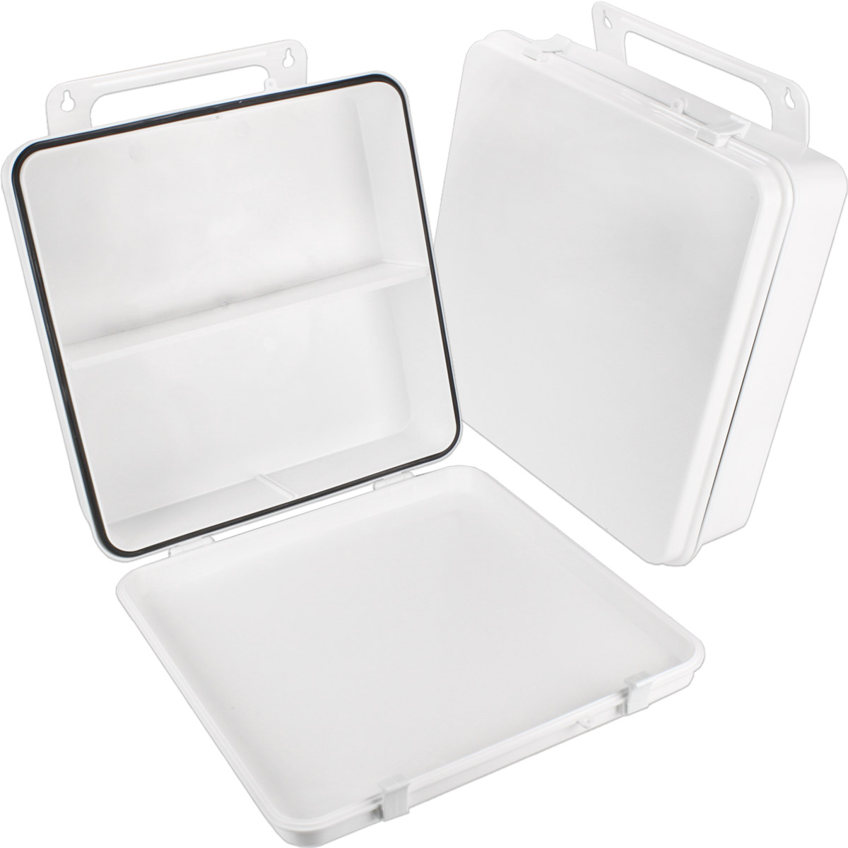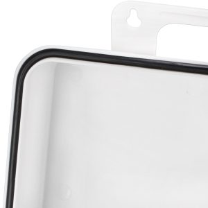 This empty plastic first aid case holds up to 24-units of product and features a gasket and polypropylene handle hanger.