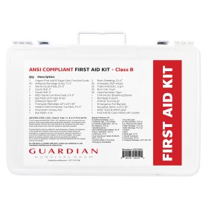 This kit meets or exceeds OSHA and ANSI 2021 Standard fill requirements, so you know you and your employees will be covered with the new ANSI 2021 requirements. This ANSI First Aid Kit includes the assortment and quantity of first aid supplies intended to deal with most types of injuries and sudden illnesses encountered in the workplace including: major wounds, minor wounds (cuts and abrasions), minor burns, sprains and strains, and eye injuries. The Guardian Survival Gear Aid ANSI B kit is great for workplaces ranging from offices to production facilities and warehouses of up to 50 people, and is easily wall mounted, or removed to be taken to the accident scene.